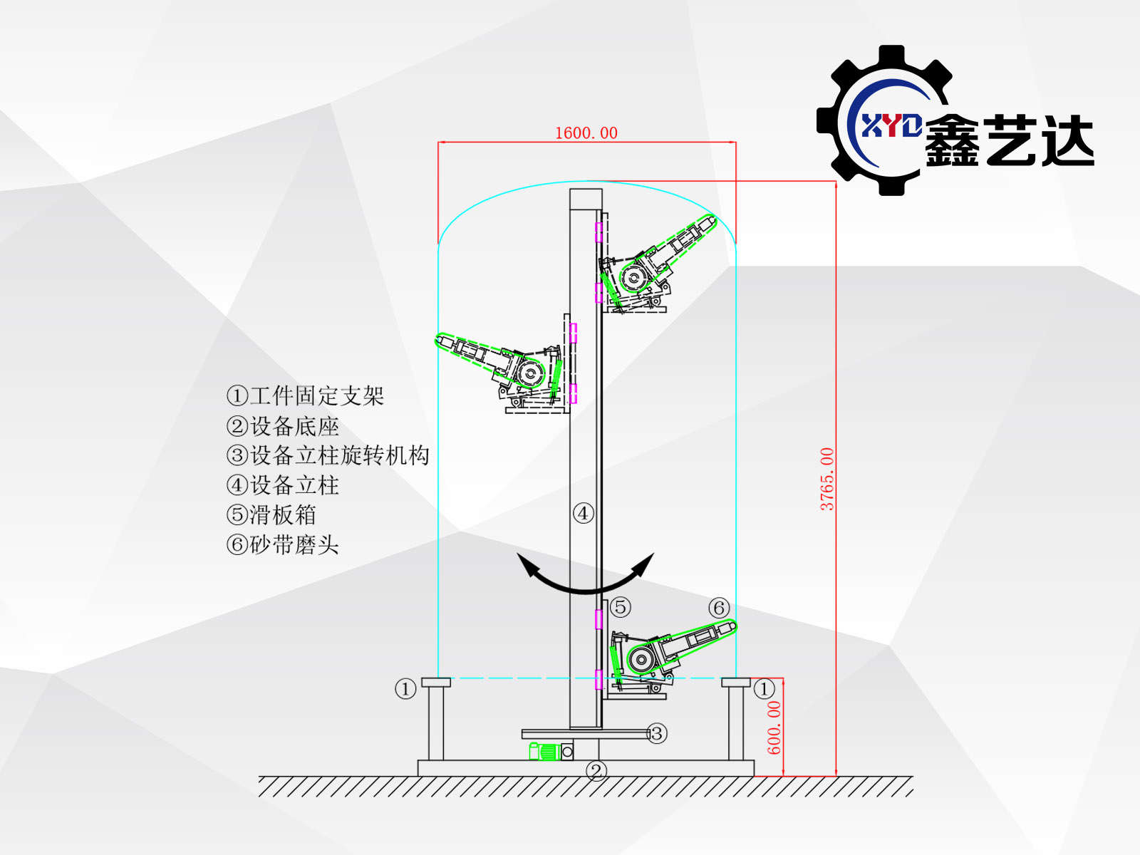 工件固定在支架上,不旋轉(zhuǎn),設(shè)備立柱可以變頻旋轉(zhuǎn),帶動磨頭完成反應(yīng)釜內(nèi)表面磨削、拋光。配合使用千葉輪、布輪等耗材實現(xiàn)工件表面粗糙度的提高。